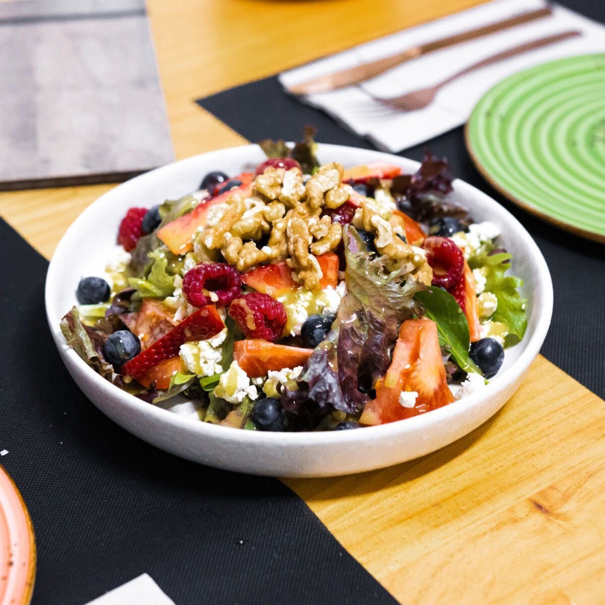 Mix de brotes tiernos con tomates, queso cebreiro o queso vegano, nueces y frutos rojos acompañado de una deliciosa vinagreta (opción vegana cambiando el queso do Cebreiro por queso vegano)