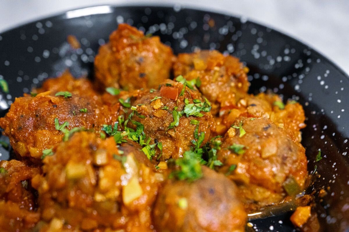 Albóndigas caseras con guisante texturizado, en un estofado de tomate, patata y verduritas