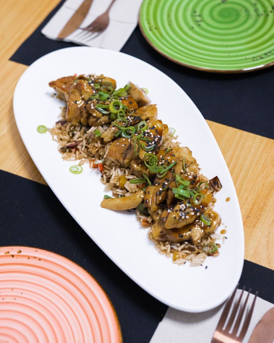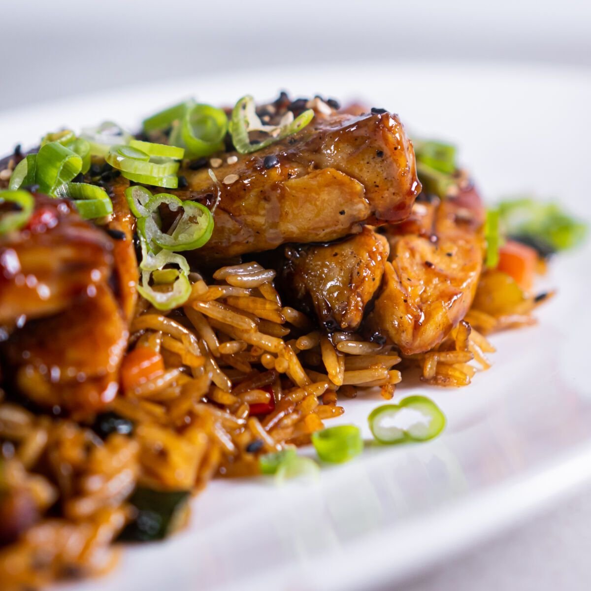 Contramuslo salteado en salsa teriyaqui casera sobre arroz frito con verduras