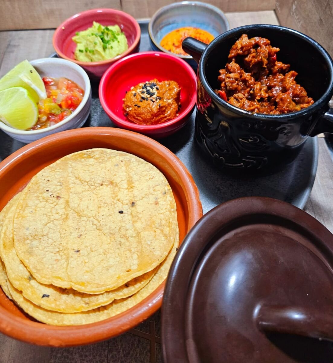 Paleta de cerdo desmechada con salsas de guacamole, romesco, pico de gallo y salsa de frijol refrito acompañado de 5 tortillas de maíz (y si te hace falta por tan solo 2,5€ tienes otras 5 tortillas extras)