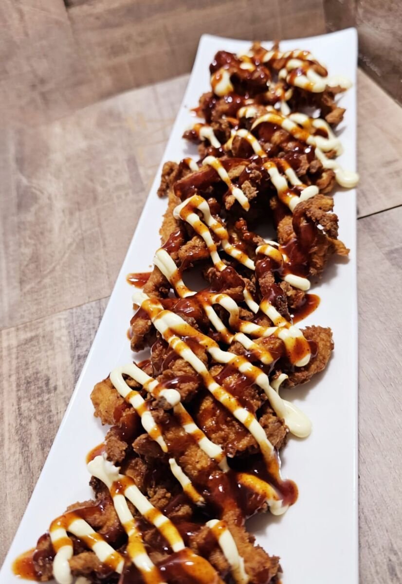 Tiras de contramuslo rebozadas con harina de garbanzo, acompañados de mayonesa de mango y bbq