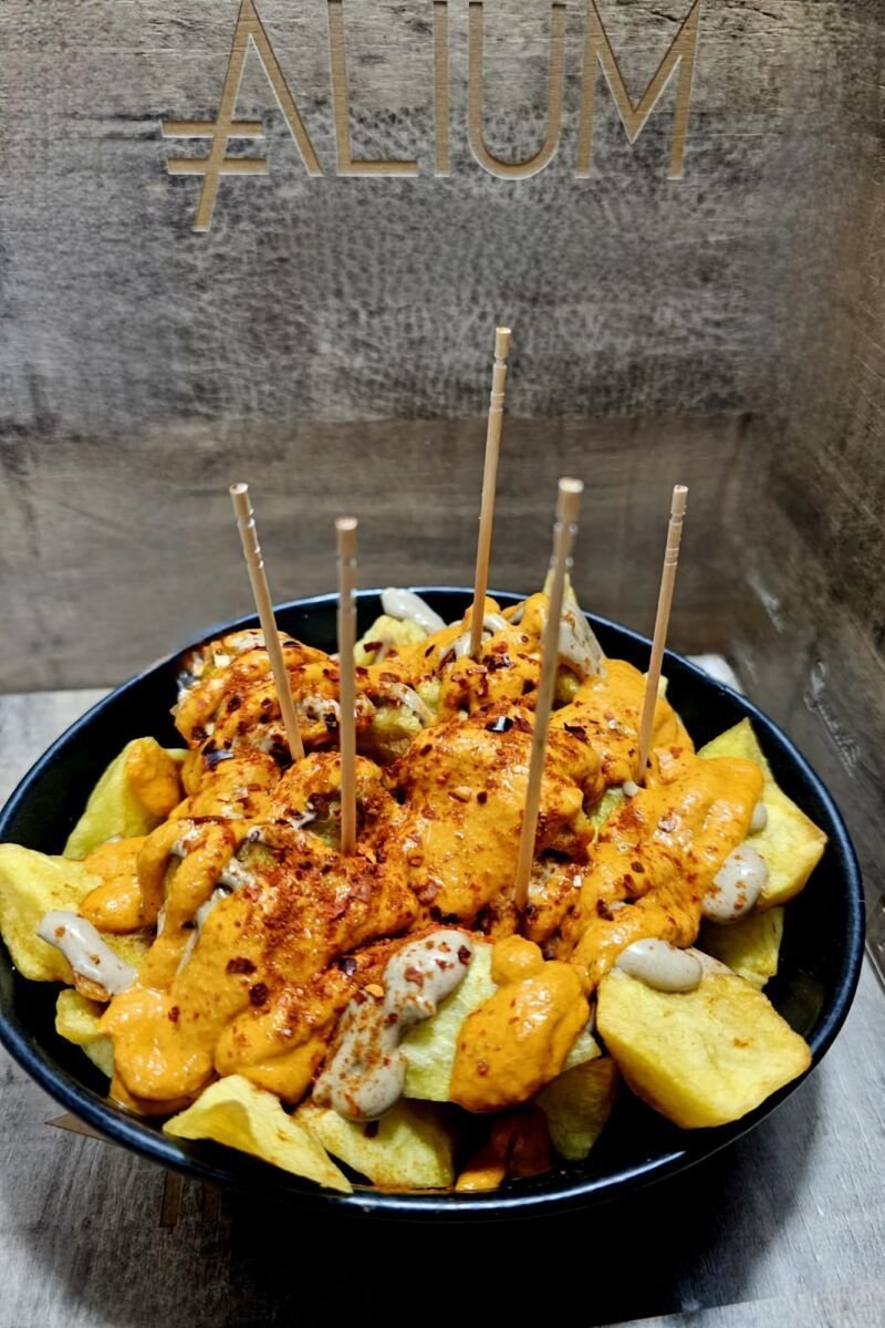 Patata gallega acompañada con nuestra salsa romesco brava y all i oli de ajo negro (en la opción vegana lleva solo la salsa romesco)