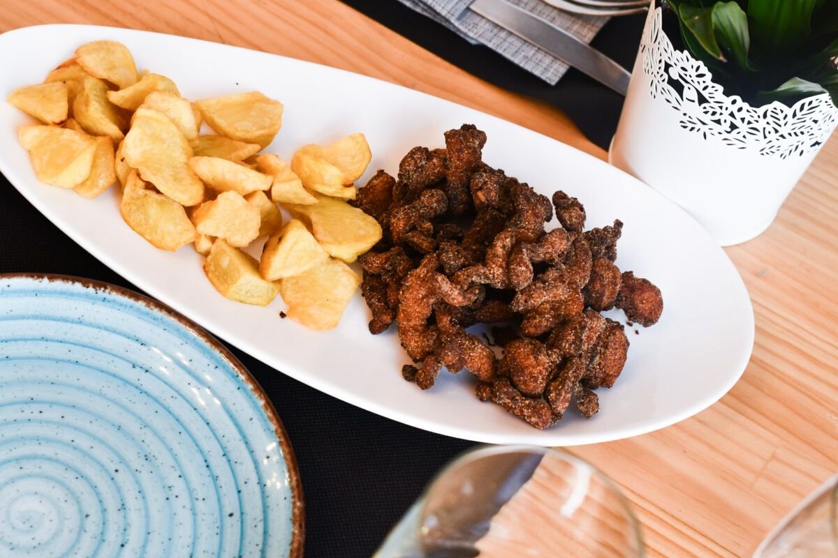 Tiras de secreto, acompañado de una cama de patatas y reducción de balsámico