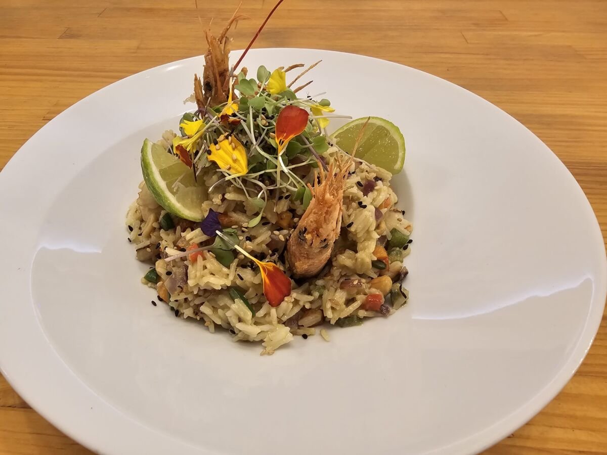 Arroz al curry verde con langostinos, cacahuetes y leche de coco