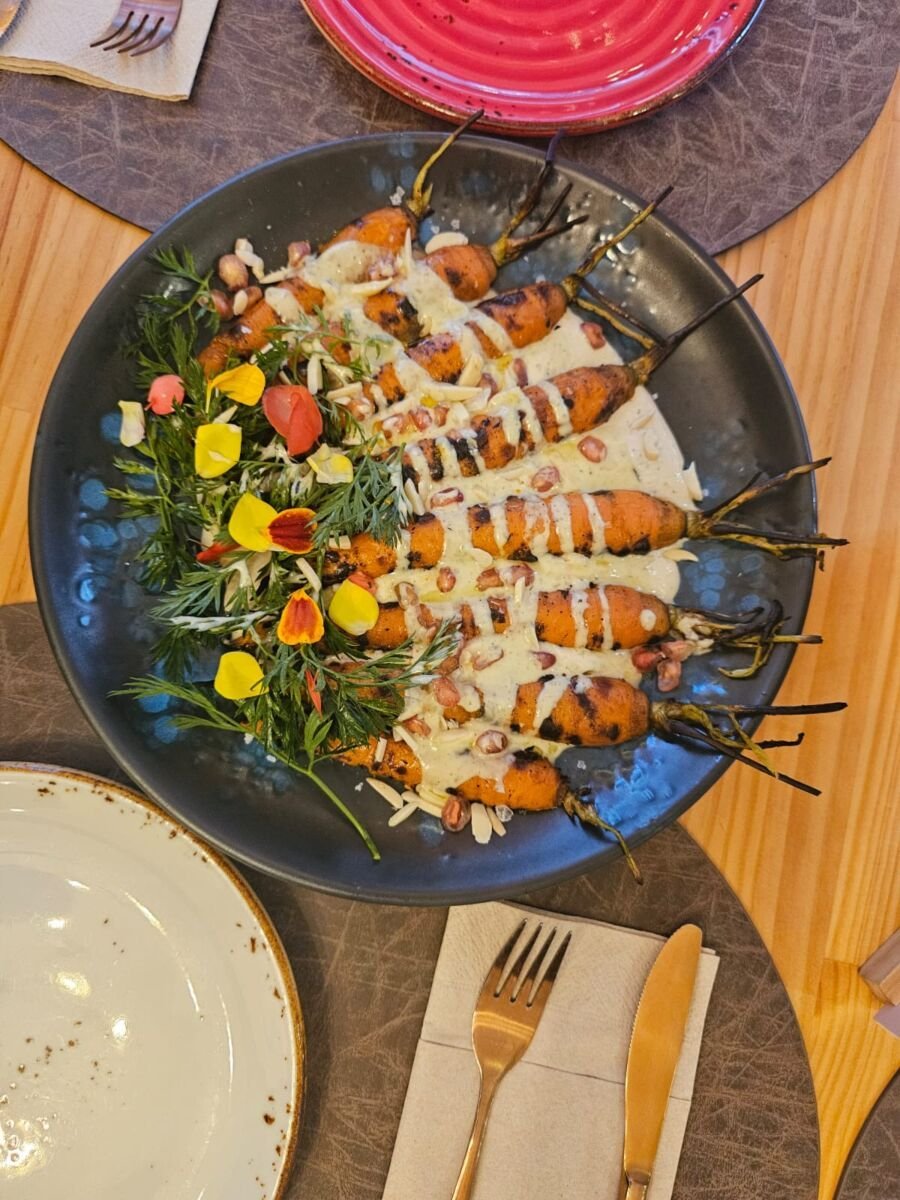 Zanahorias asadas a la brasa con crema de coco, tofu y anacardos