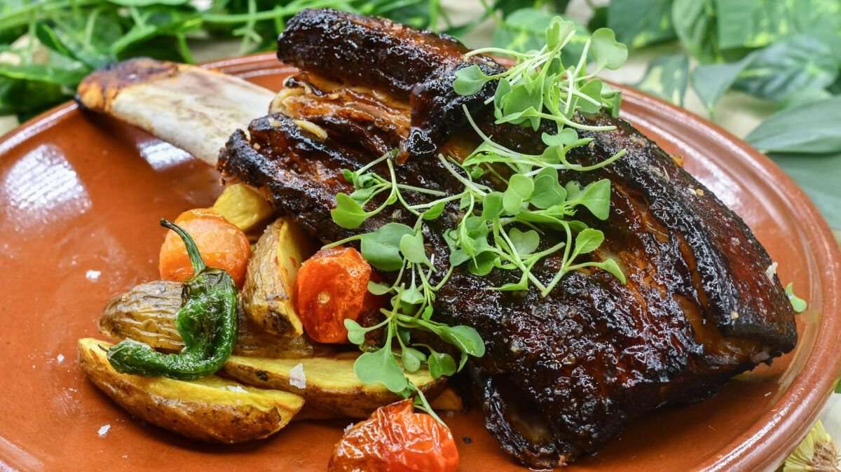Cocinado a baja temperatura durante 12 horas acompañado de pimientos del padrón, patatas y tomates cherry