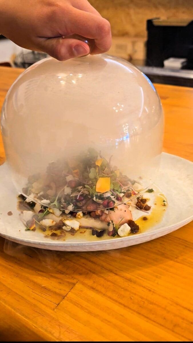 Acompañado de productos 100% gallegos: queso A MeixoEira, Calabizo sobre un puré de alubias