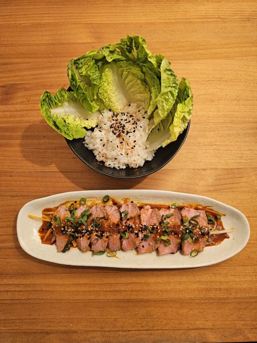 Tatatki de ternera 18€Acompañado de arroz de sushi, cogollos de lechuga, salsa gochujang y unas verduritas encurtidas