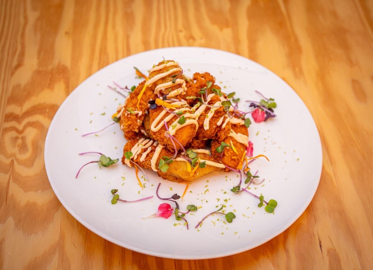 Calamares a la andaluza (versión vegana) 14,5€Elaborado con seta shitake y seta ostra, rebozados y fritos con ese toque de alga nori, lima y crujiente