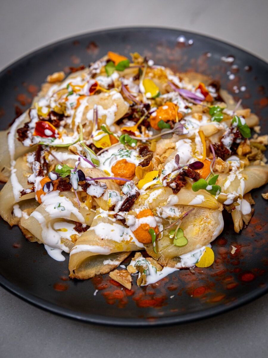 Carpaccio de apionabo 14,5€Finas lonchas de apionabo asado con nueces, crema de coco y tomate seco